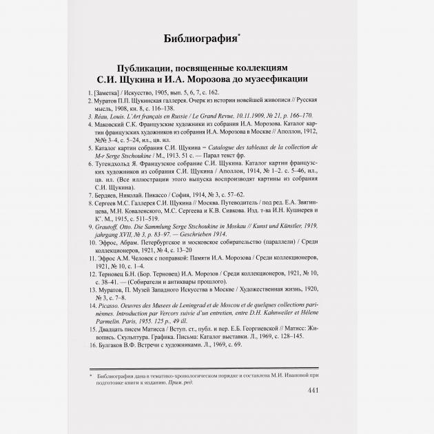 Морозов и Щукин — русские коллекционеры. От Моне до Пикассо: 120 шедевров из Эрмитажа, Санкт-Петербург, и музея им. А.С. Пушкина. Кельн: изд-во «Дюмон», 1994. — 448 с., илл.