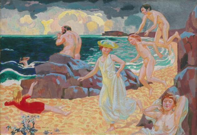 У Мориса Дени такой подход обусловлен не только эстетикой, но и необходимостью одновременно обозначить обобщенным цветом натуру современного пляжного досуга и идеализированную атмосферу античной повседневности – по впечатлениям от музейных изображений обнаженных тел.